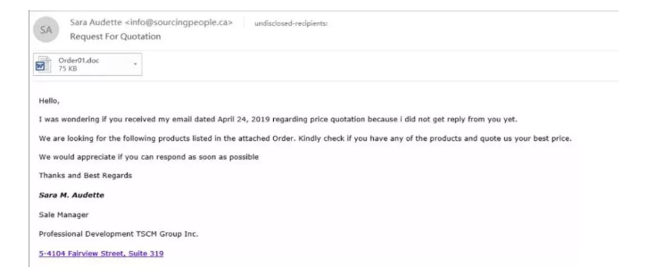 从攻击手段来看,有5类是通过直接投递病毒实体文件进行攻击,4类通过office文档进行攻击,1类通过PDF文档钓鱼攻击。其中最值得关注的仍然是office类攻击(office漏洞或者宏),缺乏安全知识的用户较容易忽略安装office补丁,或者轻易允许宏代码运行。从国内观察邮件安全情况,腾讯御界高级威胁检测系统每日捕获到的鱼叉邮件多为“订单类与支付类”,订单类主题关键字涉及“订单”、“采购单”、“Purchase Order”、“RequestFor Quotation”等;支付类主题关键字涉及有“Invoice(发票)”、“Payment”、“Balance Payment Receipts”等,并且此两类邮件的内容通常与主题相符合以诱导用户点击恶意附件。如下图与“订单”相关的邮件,通过将带有恶意宏代码的word文档伪装为附件“订单列表”,诱使用户打开文档并触发恶意宏代码或者漏洞执行,最终实现投放“NetWiredRC”远控木马。
